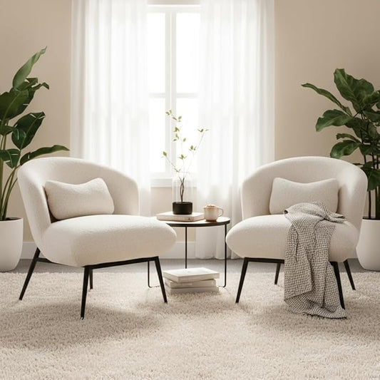 HEAH-YO Modern Accent Chairs Set of 2, Chenille Fabric Living Room Chairs with Removable Cushion and Solid Metal Frame, Comfy Reading Chairs for Bedroom, White
