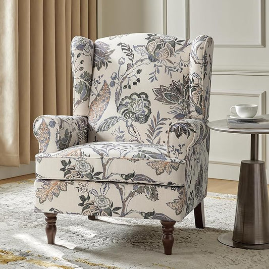HULALA HOME Wingback Accent Chair with Retro Wood Legs, Traditional Fabric Armchair for Living Room Bedroom, Comfy Upholstered Single Sofa Chair Reading Chair with Unique Pattern Design, Green