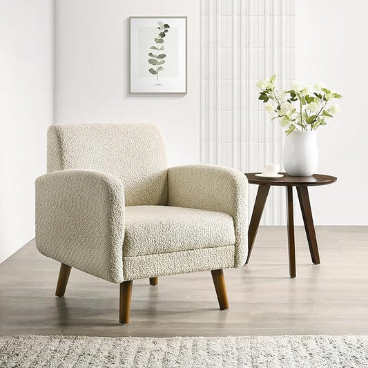 Ultra Comfortable Accent Chair with Deep Seat, Mid-Century Modern Boucle Upholstered Armchair with Rubberwood, Minimal Assembly Required, Cozy Armchair for Living Room or Bedroom (Beige, Single 1)