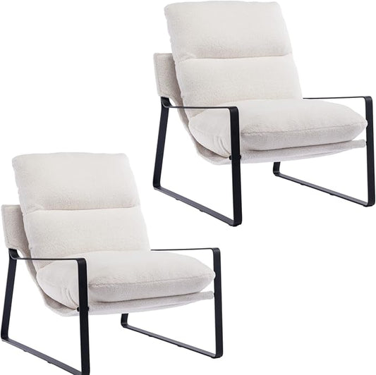 Mid-Century Accent Chair Set of 2, Comfy Sherpa Fabric Side Chair with Armrest, Upholstered Leisure Chair with Black Metal Frame for Living Room Bedroom Reception Room, White