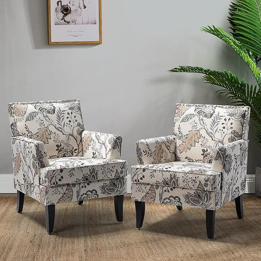 HULALA HOME Modern Accent Chairs Set of 2, Farmhouse High Back Floral Chairs with Wooden Legs & Nail Head Trim, Comfy Upholstered Armchairs for Living Room/Bedroom (Orange Grey Floral)