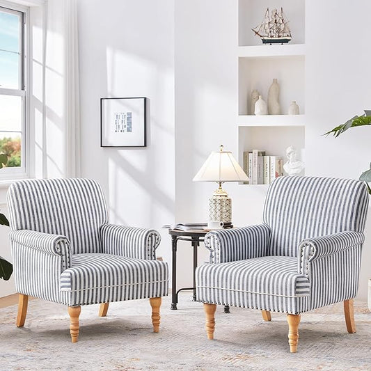 HULALA HOME Modern Accent Chairs Set of 2, Farmhouse High Back Striped Chairs with Wooden Legs & Nail Head Trim, Comfy Upholstered Armchairs for Living Room/Bedroom (Stripe Blue)