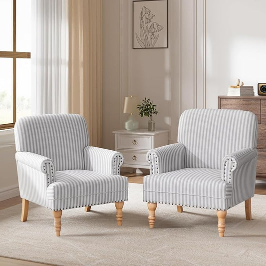 HULALA HOME Modern Accent Chairs Set of 2, Farmhouse High Back Striped Chairs with Wooden Legs & Nail Head Trim, Comfy Upholstered Armchairs for Living Room/Bedroom (Stripe Grey)