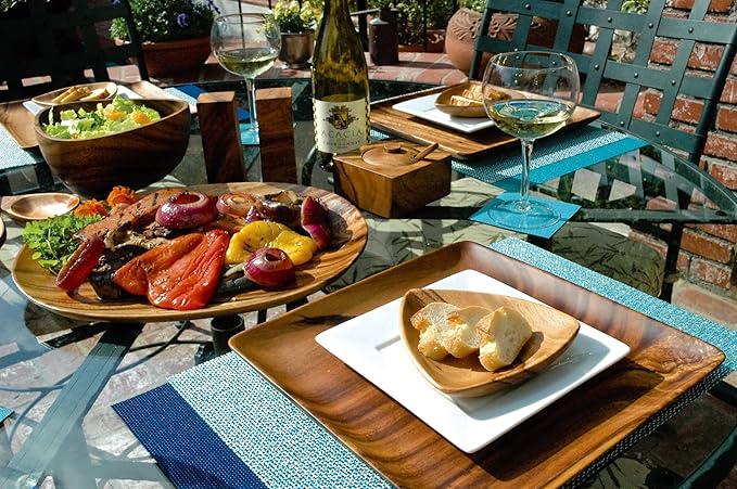 - Durable, resinous acacia hardwood with rich color and prominent grain
