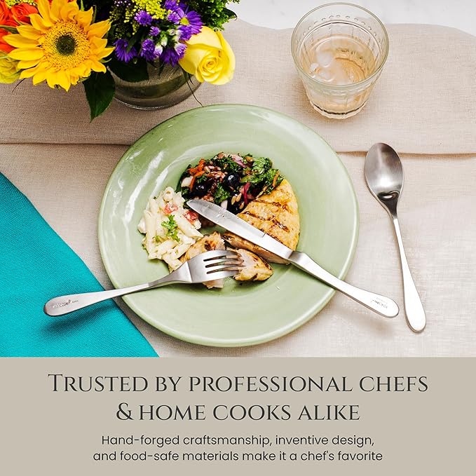 - Uncompromising Quality: Our knives forks and spoons silverware set are crafted with precision; each piece undergoes a meticulous 26-step hand-forging process to ensure unparalleled quality and durability. Our commitment to excellence extends to our manufacturing partner, adhering to the highest standards of health, safety, and ethical