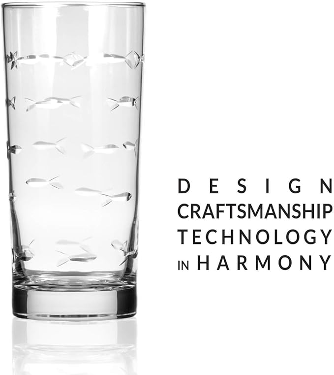 Rolf Glass School of Fish Highball Glass | Set of 4 15oz Cooler Glasses | Lead-Free Engraved Glass with Heavy Base | Proudly Made in the USA