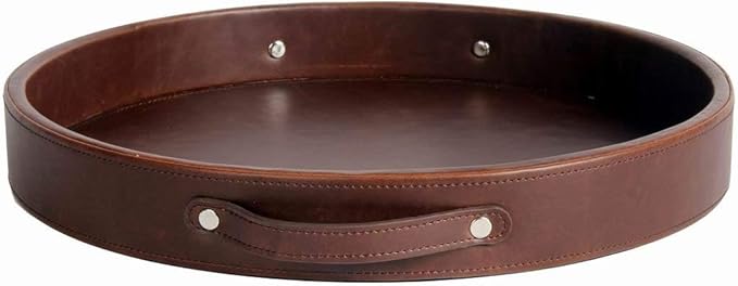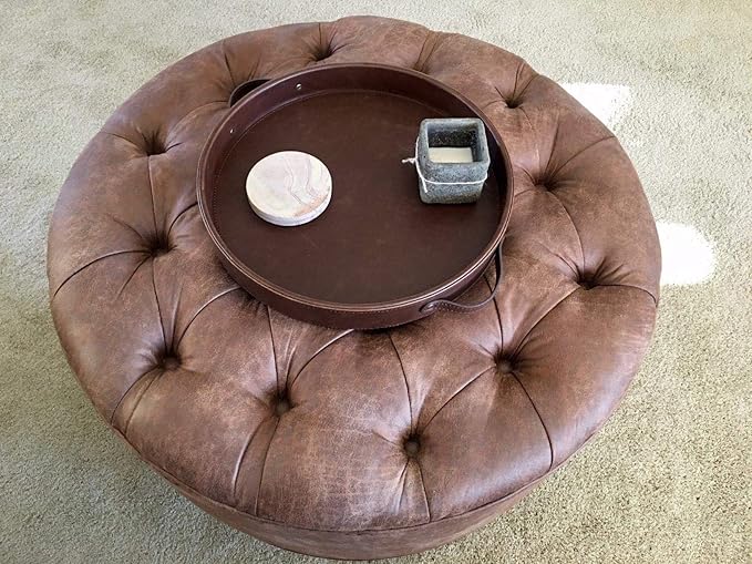 HofferRuffer Top Nocth PU Leather Round Serving Tray, Decorative Serving Tray with Handles, Coffee Tray, Ottoman Tray for Home Or Office, Diameter 14.6-inch, Brown