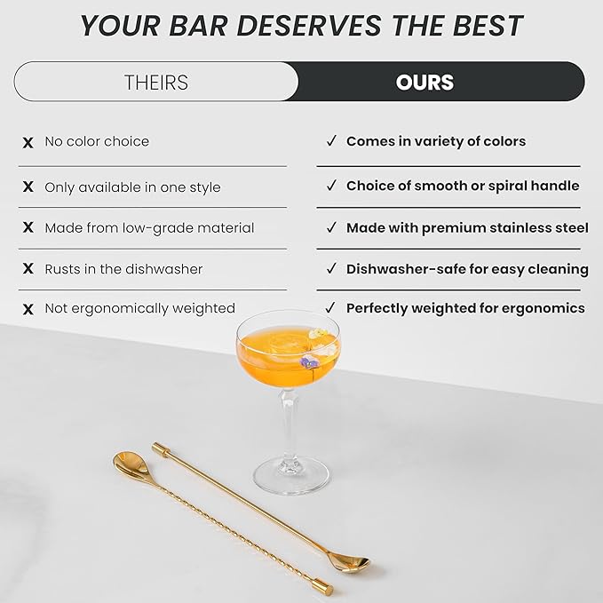 - ENGINEERED FOR CONSISTENCY AND CLEANUP: At 12 inches long with a 2.5 ml spoon bowl, this set fits standard mixing glass depths and is dishwasher safe for efficient cleanup.