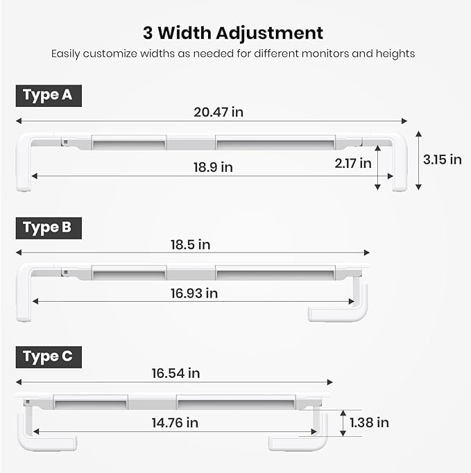 - 【3-Length Adjustable & Foldable Computer Stand】Klearlook monitor stand riser offers 3 adjustable widths - 16.5 inch, 18.5 inch and 20.5 inch, easily matching various work station. Klearlook desktop monitor stand makes extra space underneath fit your full-sized mechanical keyboard well when finished your work. The wide between 2 legs is 18.09 inches once you unfold it totally.