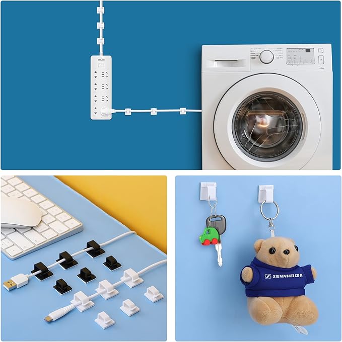 - Easy To Use -- no more hole punching or screws installation, simply tear the adhesive cover and stick the white wire clips on wherever needed, like walls, desktop, ground. Tips: wipe the surface clean enhances adhesion.