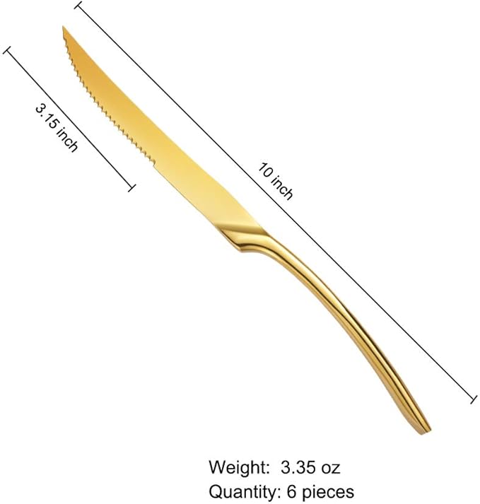 Lemeya Stainless Steel Gold Steak Knives Set of 6,Forge Steak Knife,Serrated Steak Knives Set,6 Piece Heavy Steak Knives-10 inch,Mirror Polished,Dishwasher Safe