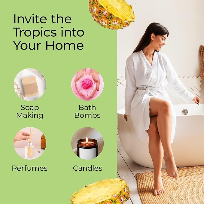 - Handmade Gifts – Improve your DIY projects with the enticing scent of pineapple in the air. Our fragrance oil makes the perfect gift. You can even make perfume. Use in skincare recipes or create a tropical island atmosphere in your home.