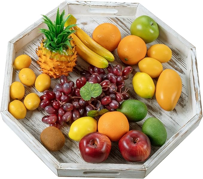 - 20-inch octagonal whitewashed wooden decorative tray with cutout side handles, perfect for entertaining or creating a display with a modern rustic aesthetic