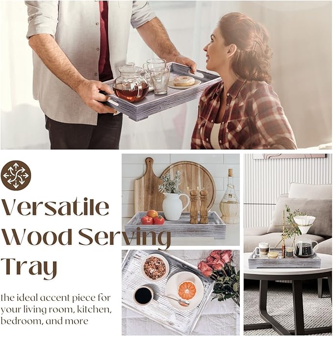 - Versatile Wood Serving Tray - Beyond serving, these wooden trays with handles decorative can also be used to organize small household items like keys and cosmetics, or as a wooden tray coffee table centerpiece