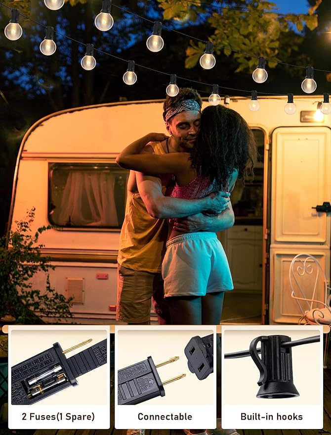 - 100 feet string lights with 102 G40 Edison clear bulbs (2 Spare Bulb), candelabra(E12) socket base,5Watt Bulbs,500W per string, 120 power.The male plug contains a spare fuse for safety-UL listed