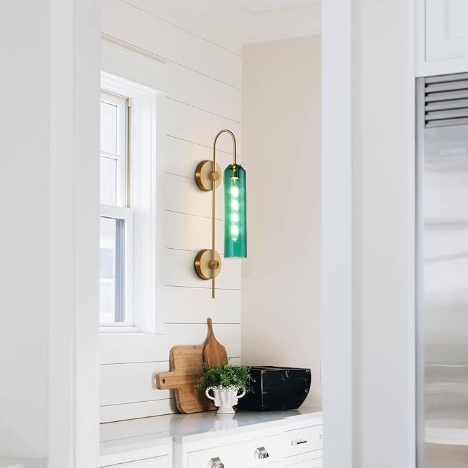 - 【Special Green Glass Lampshade】The round modern sconce light features with gold metal lamp body and luxury green glass lampshade, shows off elegant and luxurious living atmosphere, adds an eye-catching, stylish appeal to your home. Modern and retro style designs of gold wall sconces can match a variety of home styles.