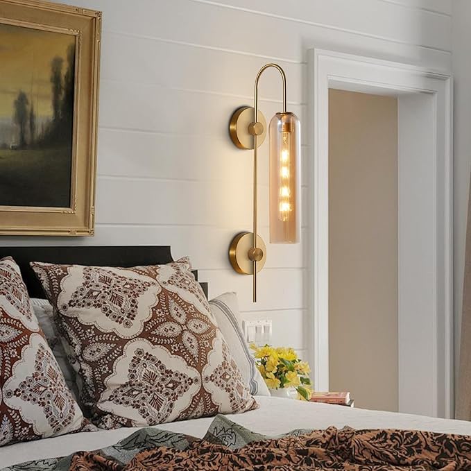 BOKT 1 Light Modern Amber Glass Wall Sconce 31" Mid Century Brushed Brass Tube Wall Sconces Lighting Gold Wall Mounted Light Fixture Indoor Bathroom Vanity Wall Lamp for Bedroom Living Room (Amber)
