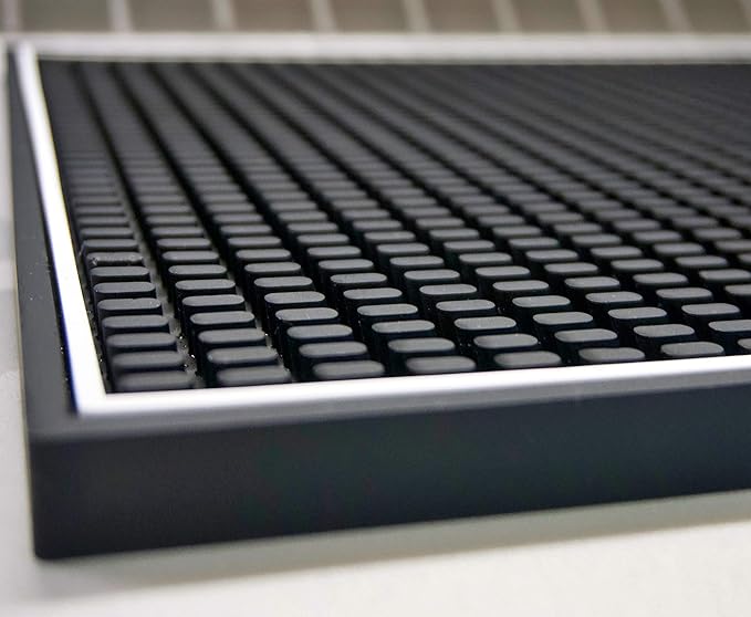 - π₯ EXTREMELY DURABLE BAR MAT: 18 in x 12 in. Made with heavy duty and flexible rubber that is a full 0.5 in thick. Ours is made with thick elliptical prongs that stabilize martini glasses, coffee machines, bar glasses, coffee cups, and improve appearance and won't tear