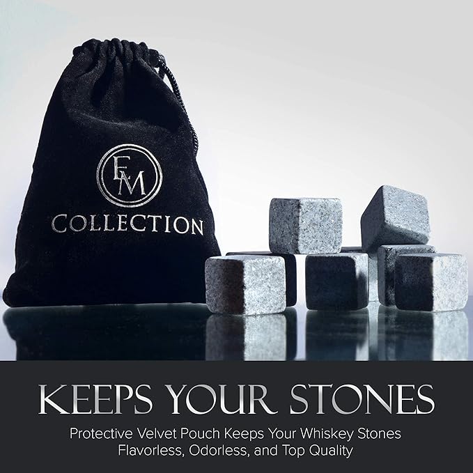 - π₯ All-in-One Whiskey Gift Set β Just add whiskey! Your EMcollection set includes 2 premium whiskey glasses, 8 whiskey stones, 2 elegant glass-silicone coasters, stainless steel tongs, all packed in a beautiful wooden gift box.