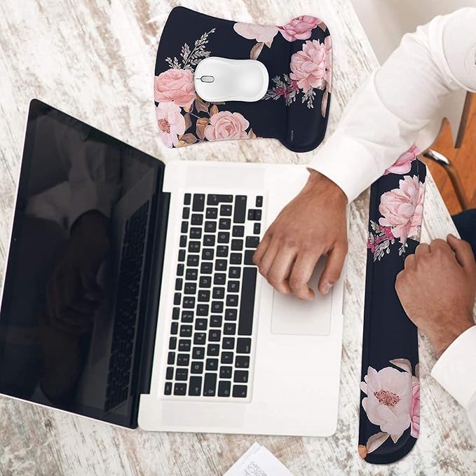 MOSISO Wrist Rest Support for Mouse Pad & Keyboard Set, Peony Ergonomic Mousepad Non-Slip Base Home/Office Pain Relief & Easy Typing Cushion with Neoprene Cloth & Raised Memory Foam, Black