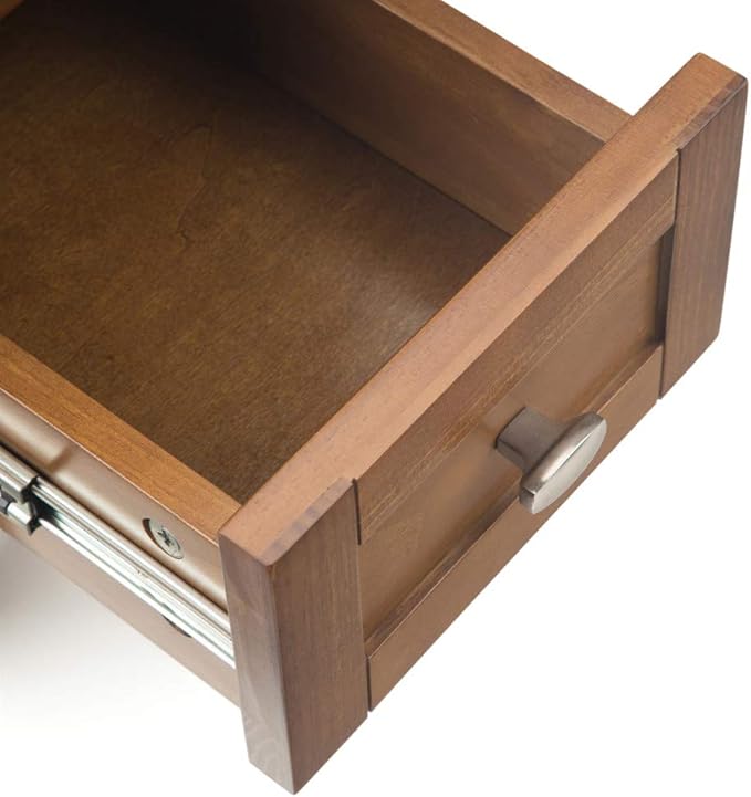 - Features one bottom drawer with metal drawer glides and large open shelf for plenty of storage