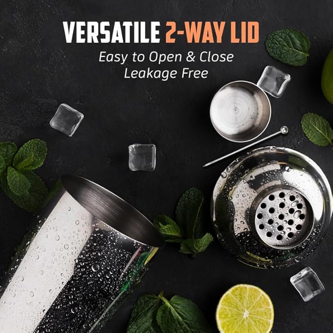 - VERSATILE 2-WAY LID OPENING - This 3-piece cobbler cocktail shaker with strainer features a versatile lid that opens and closes effortlessly and it seals securely without sticking or freezing.