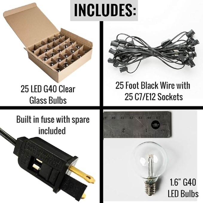 - Go green with G40 LED outdoor string lights. This set includes one 25 ft Black light string and 25 G40 LED Diode 0.6 watt clear glass light bulbs.