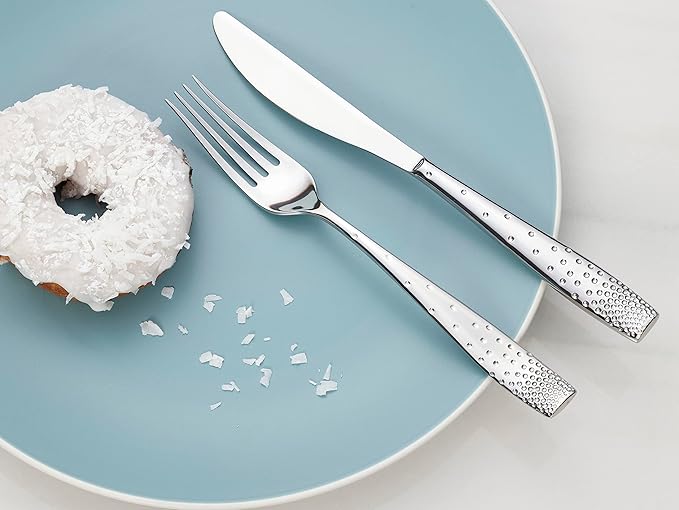 - MODERN MOTIF: This stylish flatware set is both fun and elegant, with a polished glitter of facets that recalls the playful dazzle of midcentury Hollywood. Forged of 18/10 stainless steel it is as strong as it is stylish, and even dishwasher safe for added convenience.