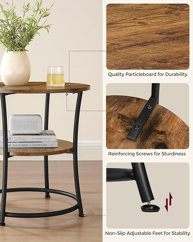 VASAGLE Side Table, 2-Tier Round End Table, Nightstand with Steel Frame for Small Spaces, Living Room, Bedroom, Rustic Brown and Ink Black