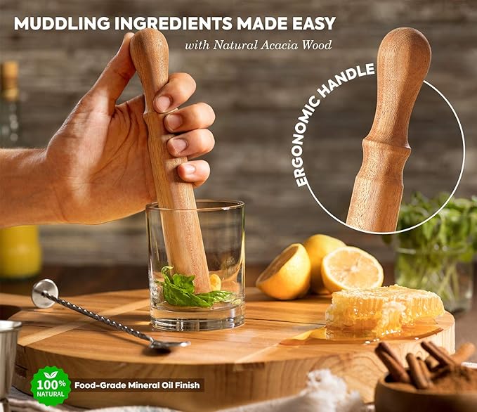 - PREMIUM QUALITY AND EASY TO CLEAN: This finely made cocktail shaker set is manufactured with rustproof stainless steel (SS304 & SS430) and solid acacia wood. Feel at ease putting the stainless steel bar supplies tools in the dishwasher *but make sure to hand wash the ergonomic and all natural acacia wood muddler.*