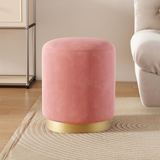 DAGONHIL Modern Round Pink Velvet Ottoman,Upholstered Floor Stools with Gold Plating Base,Accent Makeup Stool for Living Room,Bedroom and Kids Room,Pack of 1(Pink)