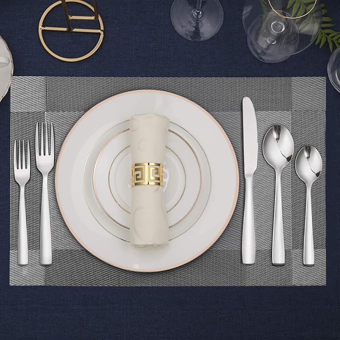 - Elegant Design & Premium Finish: Elevate your dining experience with this stunning silverware set, featuring a sleek and timeless design. Crafted with high-quality 18/8 stainless steel, it boasts a polished finish that resists tarnishing, ensuring long-lasting beauty.