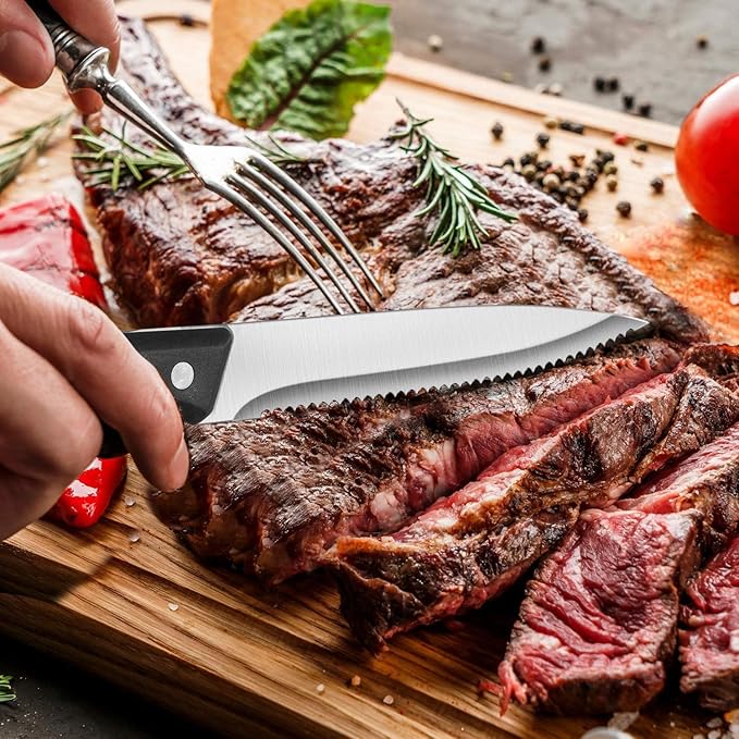 - PLENTY AND VARIETIES: Includes 12 steak knives,12 dinner forks, 12 salad forks, 12 dinner knives, 12 dinner spoons and 12 teaspoons, essential for families or restaurants. The set is also an irreplaceable dining tool whether it is for daily use or for preparing dinners or parties.