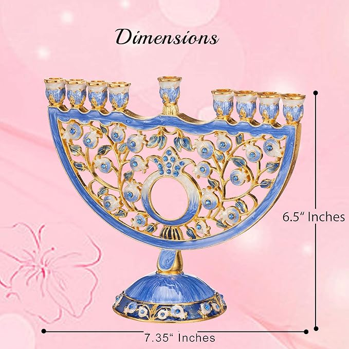 Matashi Hand Painted Blue Enamel Pomegranate Design Menorah Candelabra Embellished with Gold Accents and Crystals Jewish Candle Holder Hanukkah Gift Housewarming Showpiece for Living Room