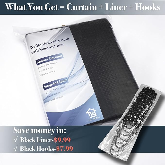 - Smart Design Set & Hotel Style: Waffle weave shower curtain with detachable liner of the same color, and free 12 black metal hooks, the entire 3-in1 set offers a complete solution for bathtub or stall