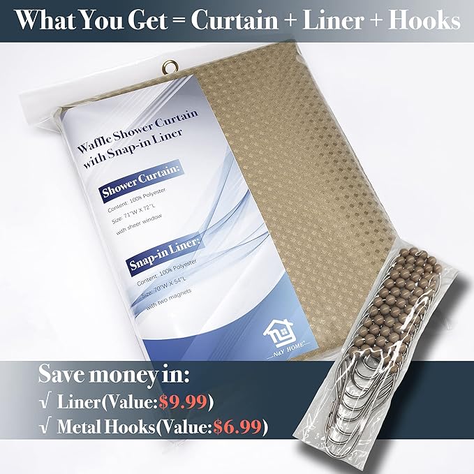 - Smart Design Set & Hotel Style: Waffle weave shower curtain with detachable liner of the same color, and free 12 metal hooks, the entire 3-in1 set offers a complete solution for bathtub or stall