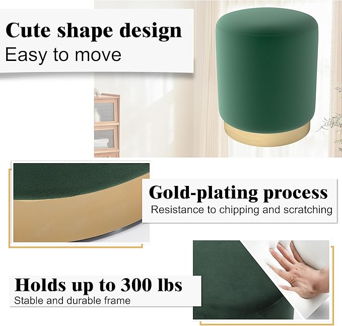 DAGONHIL Modern Round Velvet Ottoman,Upholstered Make-up Short Foot Stools with Gold Plating Base,Pack of 1,Green
