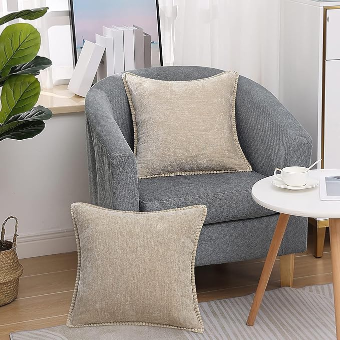 decorUhome Chenille Soft Throw Pillow Covers 22x22 Set of 2, Farmhouse Velvet Neutral Decorative Euro Pillow Covers with Stitched Edge for Couch Sofa Bed Home Decor, Beige