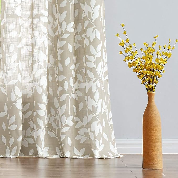 - 2 SEMI-SHEER CURTAINS: 52" w x 54"l /panel, 104" w x 54"l /pair, White leaf print on taupe curtains. Featuring beautiful subtle texture background fabric, printed semi sheer curtains also creates privacy in your home but still allows natural light in. Generous 104” width for proper look and fullness.