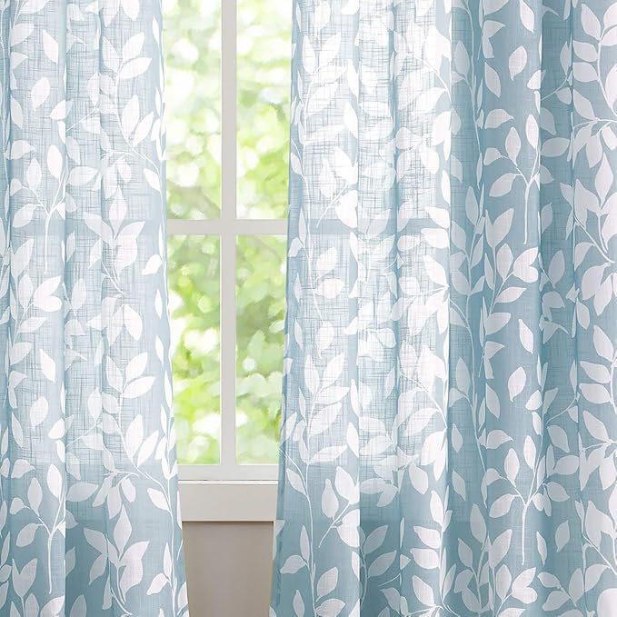 - 2 SEMI-SHEER CURTAINS: 52" w x 54"l /panel, 104" w x 54"l /pair, White leaf print on blue curtains. Featuring beautiful subtle texture background fabric, printed semi sheer curtains also creates privacy in your home but still allows natural light in. Generous 104” width for proper look and fullness.