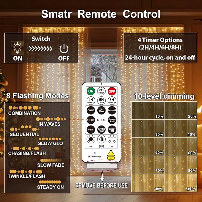 - Curtain String Lights: 9.8ft.x9.8ft and 300 Super-bright warm white twinkle LEDs window curtain light, made of copper wire, soft texture, can be cut freely without affecting the rest, so you can DIY any decoration you like. extra 16.5ft long power cord is convenient for you to access the power