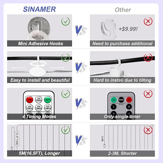 - 4 Timing Mode and Safe to Touch: The 5V low voltage makes it safe to touch, while the four convenient timing modes allow you to choose 2, 4, 6, or 8 hours of lighting, followed by 22, 20, 18, or 16 hours off, providing more options to set the perfect ambiance while conserving energy