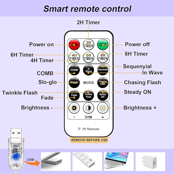 - Upgraded USB 8 Mode Remote Control String Copper Light: Each mode will bring you a different romantic atmosphere, including combination, in waves, sequential, slogs, chasing/ flash, slow fade, twinkle/ flash, and steady on; USB powered, which can be used by plugging it into the computer, power bank or USB interface