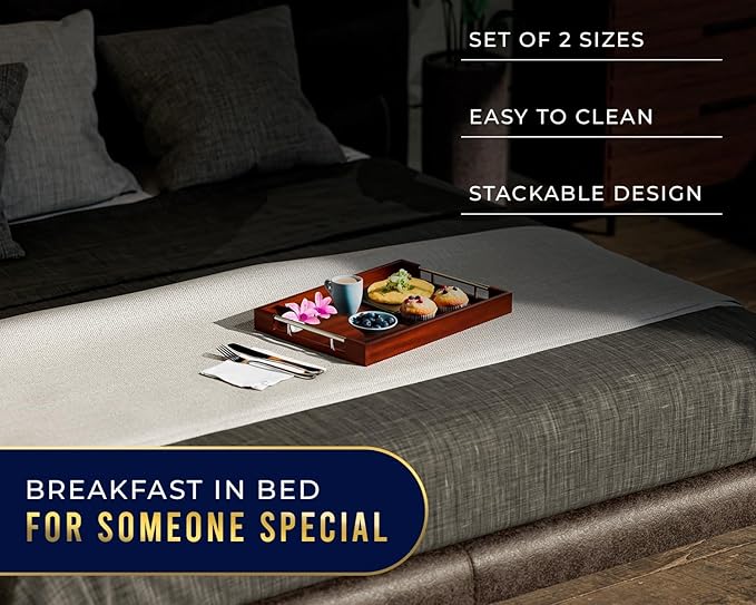 Set of 2 Decorative Serving Trays - Bamboo + Silver Stainless Steel Handles - Coffee Table or Ottoman Tray for Breakfast in Bed Jewelry, Decor Organization - 12"x17" - Stained Brown Finish