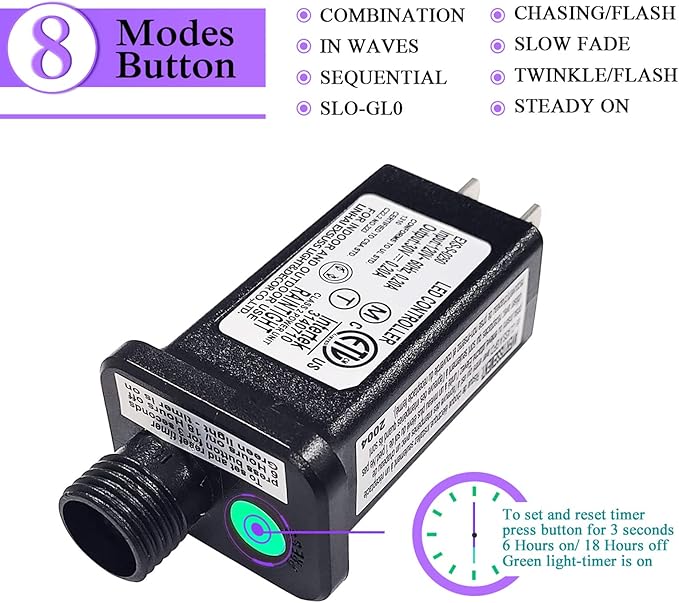 - [8 MODES ] The total length of the upgraded Christmas light is 91.5ft, 8 modes can meet your different needs on different occasions. You can change the flash mode by pressing the button on the transformer, including Waves, Combination, Fading, Fireflies, Chasing, Twinkle, Fading slowly, and Steady-on. Our extendable Christmas light also has a timing function, which automatically turns on for 6 hours and turns off for 18 hours