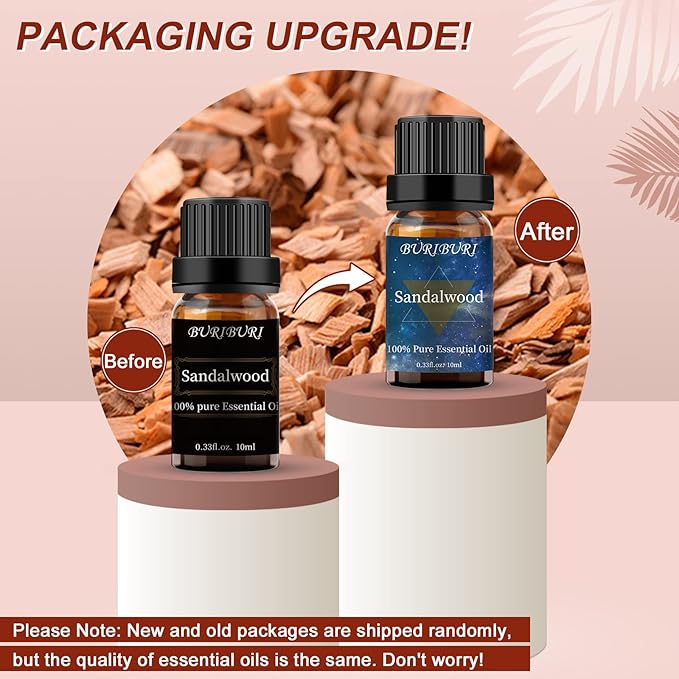 - Packing Includes: 10ml Sandalwood Essential Oil x1. With no adulterants or dilution, 100% pure. BURIBURI Sandalwood oil is bottled in a durable amber glass bottle.