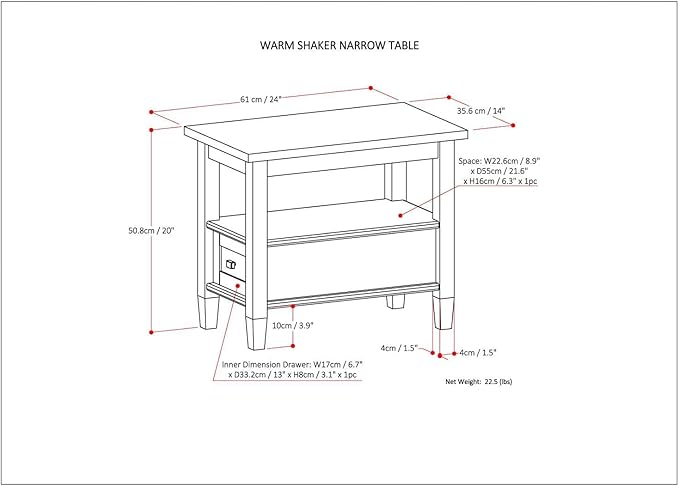 - SLIM PROFILE: Measuring 24"D x 14"W x 20"H, this narrow side table fits easily into compact spaces beside sofas, chairs, or beds.