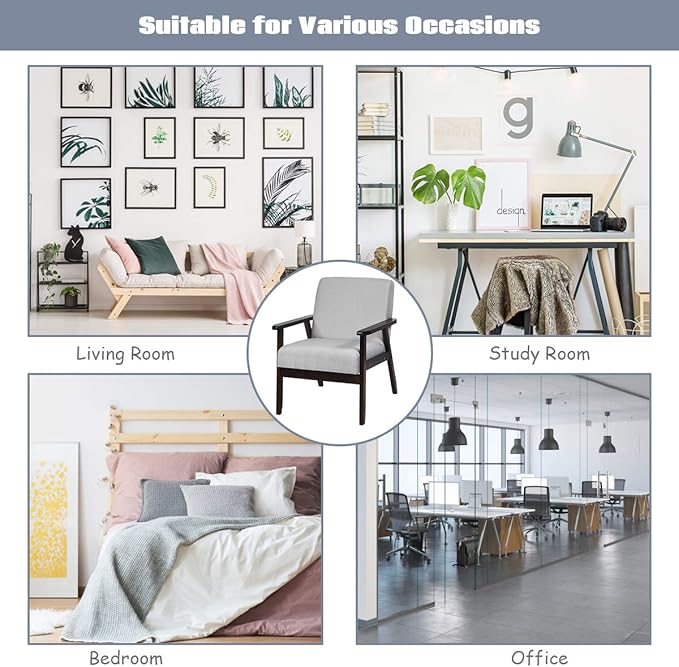Giantex Mid-Century Modern Accent Chair, Retro Fabric Armchair, Solid Hardwood Made, Upholstered Linen Lounge Arm Chair for Living Room (1, Light Grey)