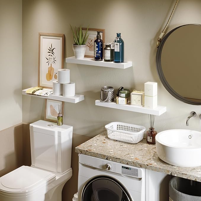 BAMEOS Floating Shelf,Wall Shelf,Decor Wall Mounted Shelves,Hanging Shelf Set L24xW6 for Bathroom Kitchen Living,Kitchen,Room Bedroom Storage,White
