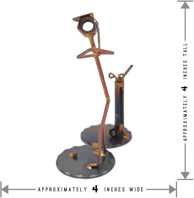 - GOLF BACKSWING MAN WITH CLUBS figure is crafted from nuts, brazing rods, washers, steel, and is great to use as a trophy or to accompany your business cards for a fun, eye-catching desk accessory. (The business cardholder may be purchased separately.) Approximately 4″ wide by 4″ tall.